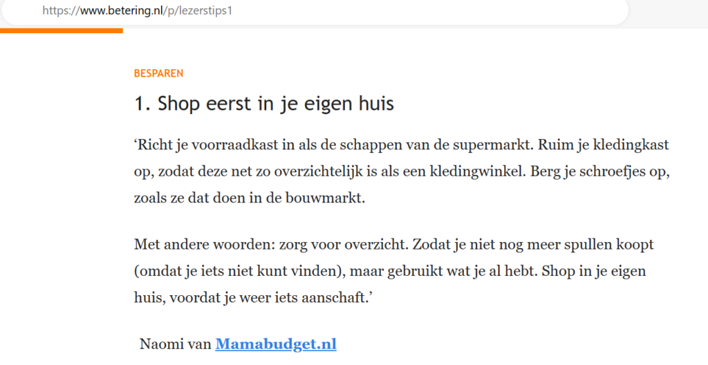 Als je geen overzicht hebt, ga je vaker geld uitgeven terwijl dat niet nodig is. Tip: voordat je gaat winkelen (online of daarbuiten) moet je eerst nagaan wat je in huis hebt. Ga eerst voor je kleding in je eigen kledingkast shoppen. Wat heb je al en wat ontbreekt er? Dan kun je gerichter kopen wat je nodig hebt. Dit geldt echt voor alles: boodschappen, kleding of klusspullen etc. Je hoeft niet nog een mooie zwart jurkje te kopen, je hebt er al 3! Dus, lieve Naomi, practice what you preach. Ga door met opruimen, sorteren, gebruiken en hergebruiken van wat je al in huis hebt. Geef niet op, zeg ik tegen mezelf.