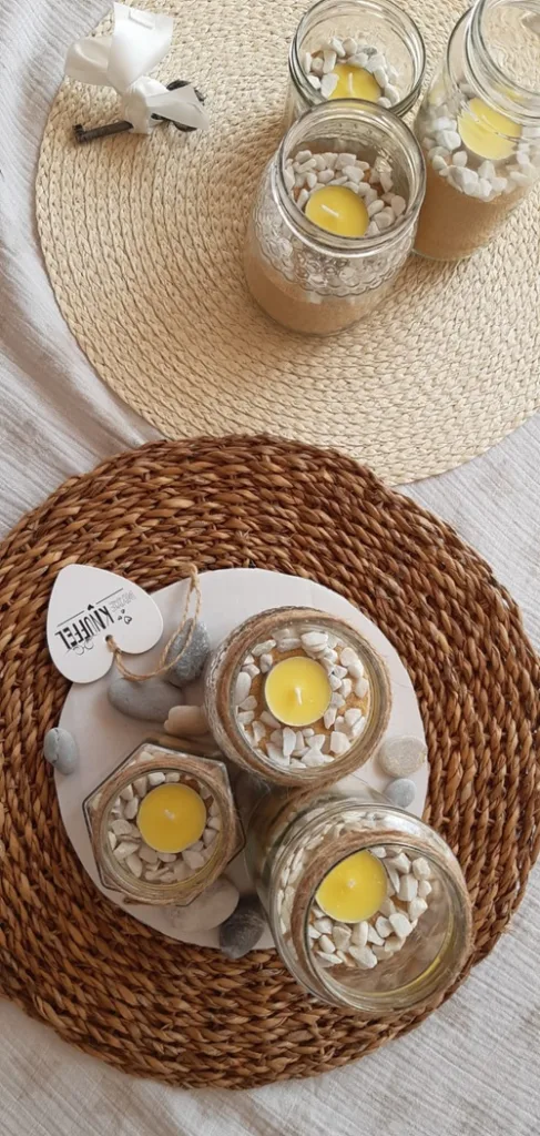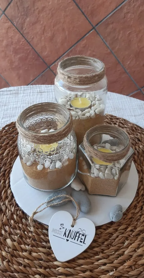 Om even terug te komen op de landelijke stijl: ik heb touw gebruikt om het en natuurlijke uitstraling te geven. Dat zorgt ervoor dat je theelichthouders – er voor mij – er sowieso leuk uitzien. Ik heb ik drie glazen potten gebruikt met zand en speciale witte steentjes erin, maar zonder het touw ziet het er te gewoontjes uit.